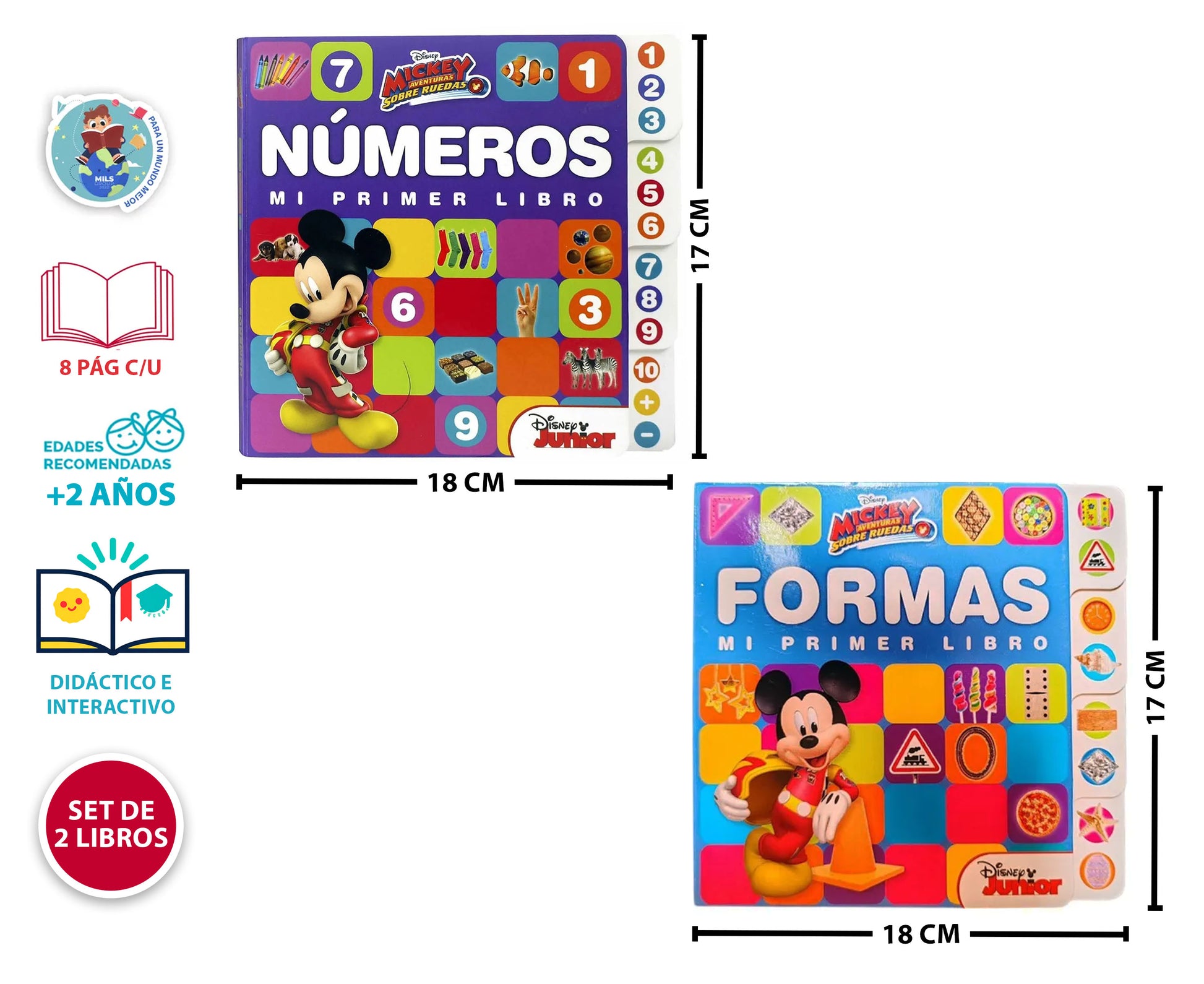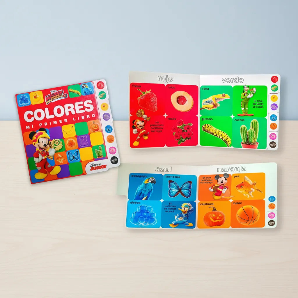 ¡Aprender con Mickey y sus amigos nunca fue tan divertido! Este set de libros didácticos ha sido diseñado especialmente para niños a partir de los 2 años. Cada libro presenta conceptos básicos —números y formas— a través de ilustraciones coloridas, personajes entrañables y textos simples que acompañan el proceso de aprendizaje de forma natural y entretenida. Contenido del set: - Mi Primer Libro – Colores - Mi Primer Libro – Primeras Palabras - 8 páginas por libro - Personajes de Disney Junior como Mickey Mouse y amigos Beneficios para el desarrollo infantil: - Introduce conceptos matemáticos básicos de manera visual y entretenida - Favorece la memoria visual y el vocabulario mediante ilustraciones llamativas - Despierta el interés por aprender jugando, en compañía de personajes queridos Ideal para papás que buscan materiales educativos de calidad, maestras en etapa preescolar o como regalo que deja huella desde los primeros años. ¡Aprender nunca fue tan adorable!